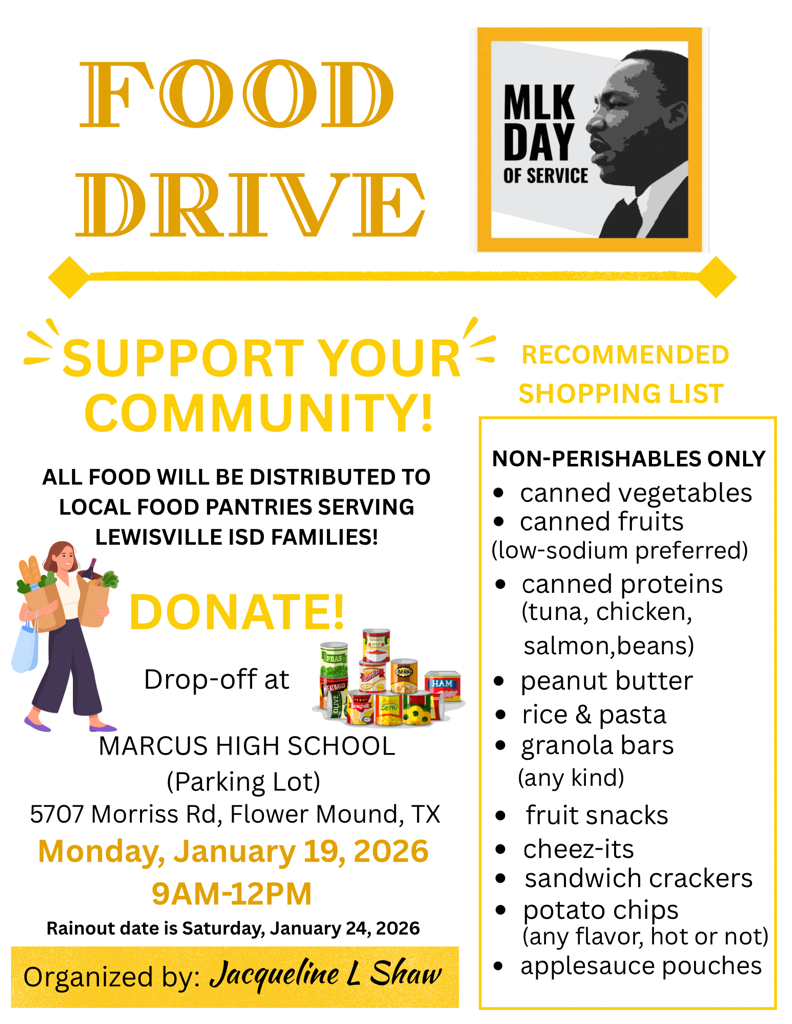 This MLK Day of Service, Jacqueline L Shaw and Community Partners, is expanding our impact beyond volunteer sites by inviting the community to donate non-perishable food items to support food pantries across Lewisville.